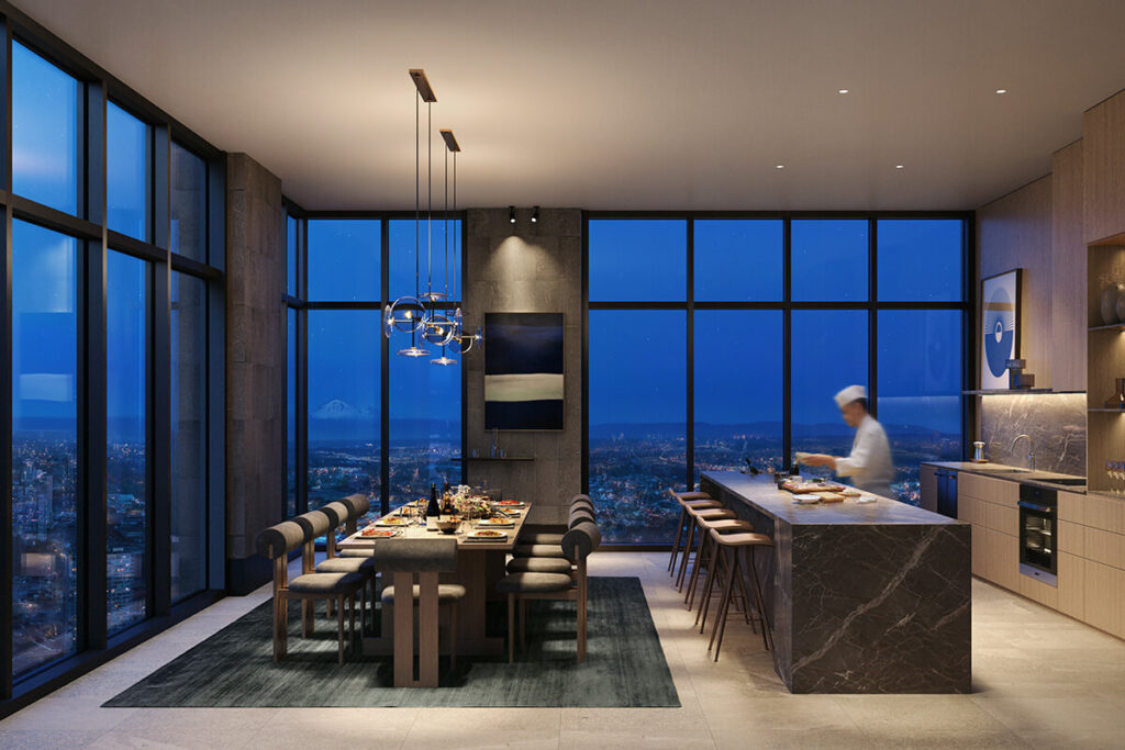 As with the best design, the details tell the story: the quiet drama of floor-to-ceiling glass, the rich textures of the interiors, the seamless flow from the private residences to the shared penthouse in the sky.