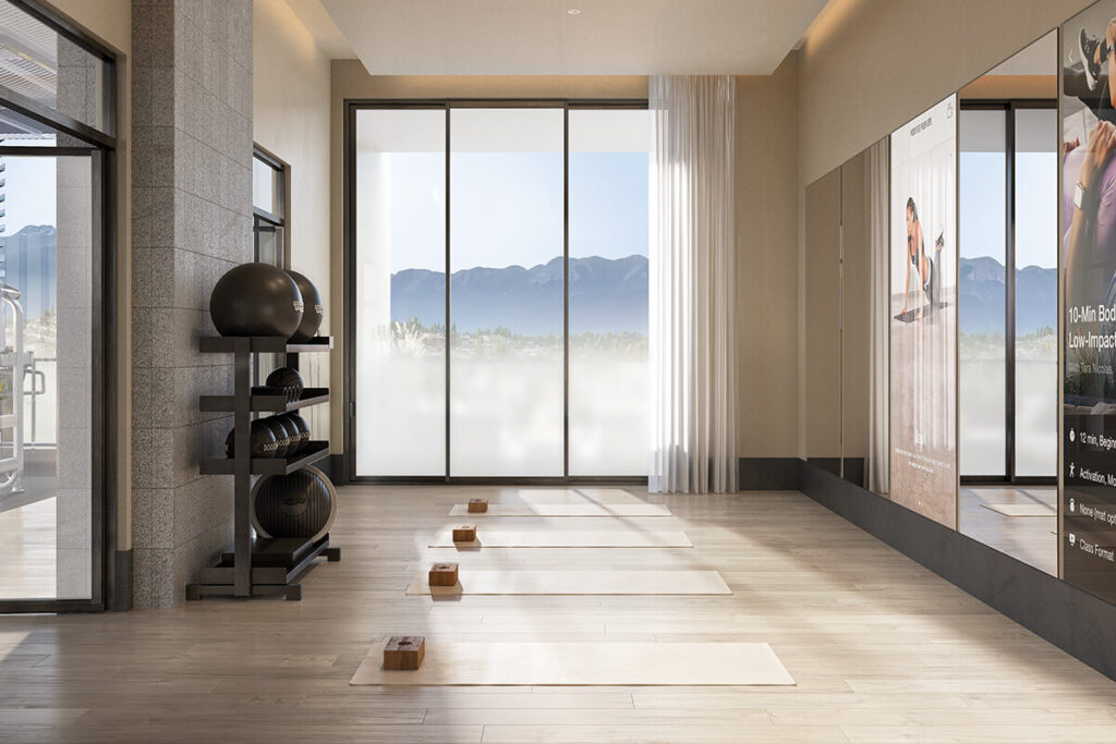 The rooftop fitness centre, outfitted by Technogym, is encased in floor-to-ceiling glass, offering a workout backdrop of ever-changing skies. Beside it, the dedicated workout studio accommodates everything from high-intensity sessions to meditative practices. Integrated digital screens and app connectivity ensure a modern, personalized training environment.